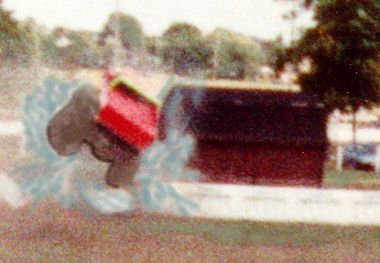 The barriers that were filled with water to stop the Monster Trucks have no affect on Snake Bite. Here you can see him careening out of control heading towards a storage shed.