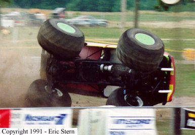 This is a perfect example of a driver trying to keep his truck from flipping. You'll see all four wheels turned into the dirt, and the driver is on the throttle very hard trying to get traction to prevent the truck from rolling over. Believe it or not this sometimes works.