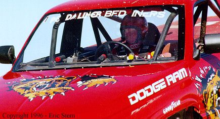 Fred Shafer is one of the few drivers that still uses an open-face helmet. Notice how the roll cage is built close around the driver, even though he is seated in the center of the cab. Being seated there helps the drivers to see side to side better, distributes the weight evenly across the truck, and prevents the drivers arms from going out the windows in the event of a roll over.