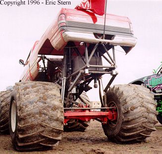 Fred Shafer's trucks sit so high in the rear due to the shocks. They are nearly fully extended so when the race begins they can soak up impacts instantly when landing.