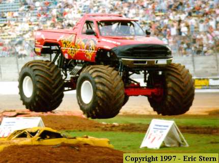 Since Dodge opted not to renew their sponsorship with Bearfoot in 1997, Fred had a nose cover created to change the look of the Ram body style. All of the Dodge emblems and stickers are also off of the truck.