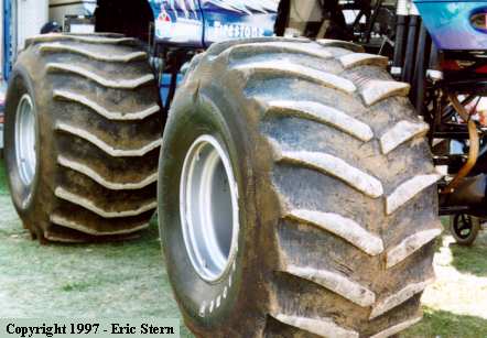 Team Bigfoot is constantly trying new things to stay ahead of the competition. Here the Firestone tires have been very uniquely cut to achieve better traction. The rear tires are a solid "paddle" design like in mud racing. The front tire treads are not only cut sharp and low but off center as well.