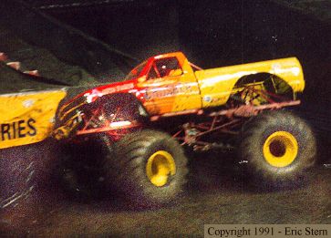 Carolina Crusher slides into a wall while making a turn indoors during a race in Chicago, Illinois.