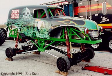 Grave Digger is transported from show to show with these small tires on, so it can fit in the hauler. There is about 3" of ground clearance under the axles when these tires are on.