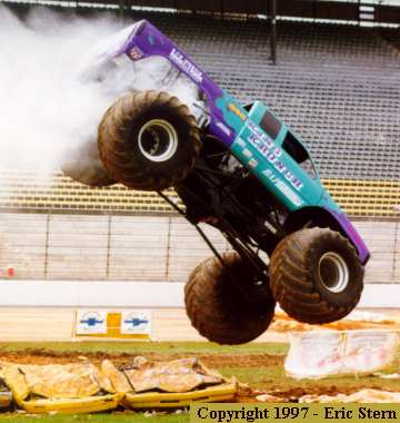 After the rear shocks broke on the second-to last set of cars, Scott Stephens can only hang on for the ride as the truck's rear end wildly bounces high into the air.