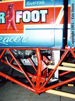 Fred had a very good chance to win the 1991 Camel Mud and Monster Truck Racing World Championship until a huge shock failure in the first round the night of the finals put him out for the weekend. Fred was racing Grave Digger and landed very hard, blowing all of his rear shocks out - and causing the frame to crack in half. (Where the orange and yellow bars meet in the center).