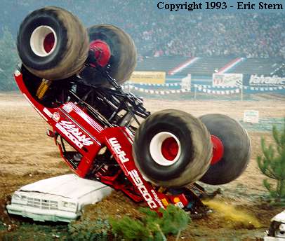 Ken Deppe flips the Dodge Express on top of the cars at the 1993 US Hot Rod World Championships in Pontiac Michigan. Ken was unhurt, but the brand new Dodge Ram fiberglass body was just purchased 3 days earlier. It will cost them about $5,000.00 for another one. You can see the engine oil gushing out of the overflow tubes at the rear of the truck.