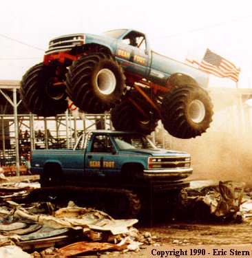 One of the best photo opportunities ever. Fred Shafer launched his Racer over the Bearfoot Trax Monster Tank. The truck came so close to hitting the roof of the tank the front axle actually hit and bent the flag that was sticking up out of the tanks bed. Right after that team mate Scott Hess did the same thing with his truck.