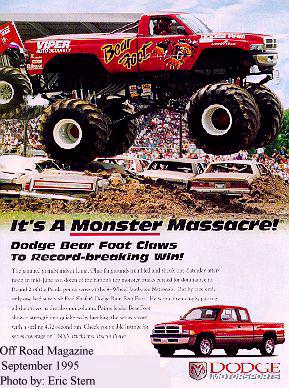 This full page ad for Dodge Motorsports appeared in the September 1995 issues of Off Road and Petersen's Four Wheel Magazines. Dodge ran the ad after Bearfoot set a new worlds speed record, and won the event that day. Dodge Motorsports was Bearfoot's primary sponsor from 1992 to 1997. I took the photo in Lima, Ohio in 1995.