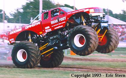 The first rear engined Monster Truck for Fred Shafer. Bearfoot #11 was so fast, and when it landed, it stuck like a wet sponge. Fred often had transmission/clutch trouble because he had so much power. Another result of too much power was that the truck would do a wheelie - sometimes nearly the entire length of the track.