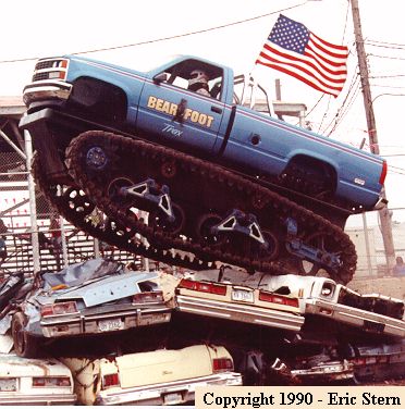 Fred even campaigned a Monster Tank called the Bearfoot Trax back in the late 80`s and early 90`s. It's an actual army tank chassis with a truck body mounted on top. The engine sits in the bed, and it is steered with two levers, not a steering wheel. Tank racing was very hard on the drivers, there was no suspension, and the tanks weighed about 4x what the trucks did.