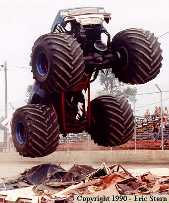 Little Bearfoot was made to represent a chevy S-10 pickup. It had a very short wheelbase so turning was very easy, and it was quite light so it jumped good too. It had wheelie bars in the back because the drivers would stand straight up on end so often that Fred knew sooner or later it would roll over backwards - and eventually it did.